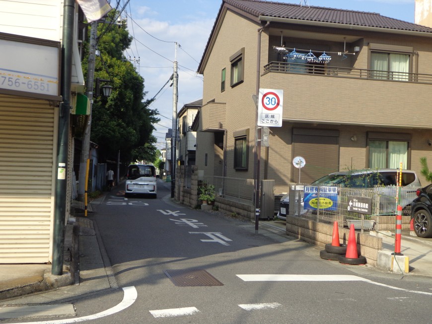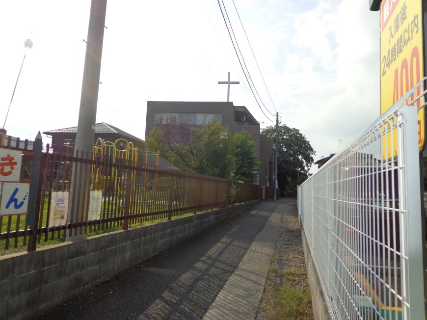 | 左側が幼稚園の園庭です。この細い道に入ります。 |